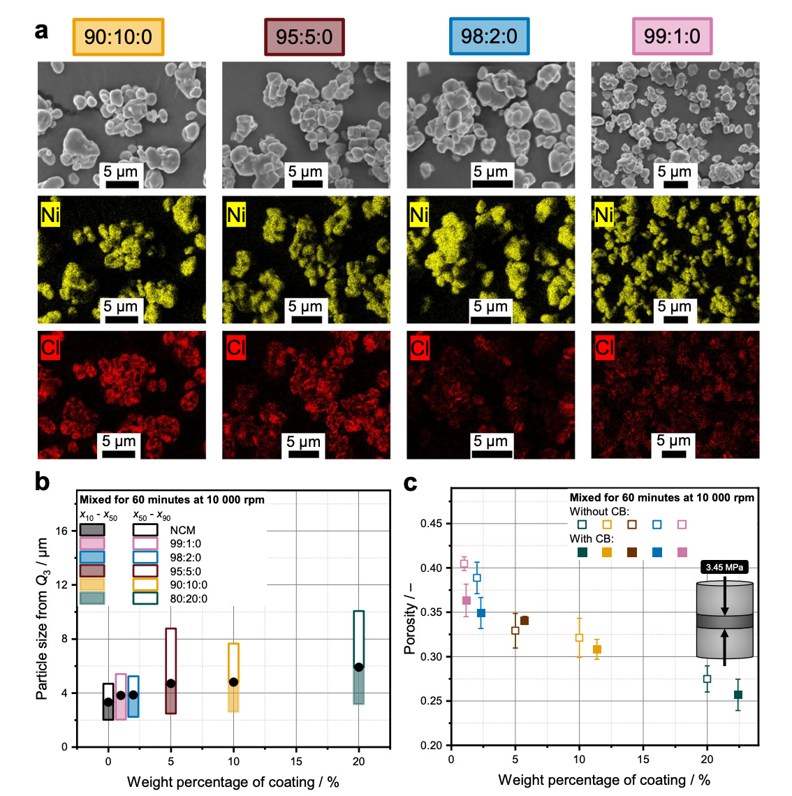 Solid-state batteries are widely considered the most important next step in battery technology. They replace the flammable liquid electrolyte used in conventional lithium-ion batteries with a solid material — a ceramic, a glass, or a polymer — that conducts lithium ions without catching fire. This change eliminates the most dangerous failure mode of current batteries: thermal runaway, the self-reinforcing overheating process that causes lithium-ion fires in electric vehicles, storage facilities, and consumer devices. Beyond safety, solid-state batteries offer the potential for higher energy density — more energy stored per kilogram — which directly translates into longer electric vehicle range and smaller, lighter battery packs for the same performance. Every major electric vehicle manufacturer and battery producer has announced solid-state battery programmes. Toyota, Samsung SDI, QuantumScape, Solid Power, and dozens of others are investing billions in the technology. The problem that has prevented solid-state batteries from reaching commercial production is not the solid electrolyte material itself — several candidates have been identified and validated in laboratory cells — but the manufacturing of the cathode composite. In a solid-state battery, the cathode is not a simple layer of active material coated onto a metal foil, as in conventional lithium-ion cells. It is a composite of three components that must be intimately mixed at the nanometre scale: the active material particles that store lithium, the solid electrolyte that conducts ions between them, and a conductive additive that carries electrons. Achieving a uniform, controlled distribution of these three components in a form that can be produced reliably at high throughput, without solvents, and at a cost compatible with commercial battery manufacturing has not been demonstrated before this research. The paper published in Nature Communications on 3 April 2026 by Kissel, Frankenberg, Janek and colleagues from Justus Liebig University Giessen and TU Braunschweig addresses this gap directly, reporting a dry mechanofusion process that produces tailored coatings on single-crystalline cathode particles with quantified electrochemical performance and a computational framework that gives industrial process engineers a design tool rather than just a recipe.